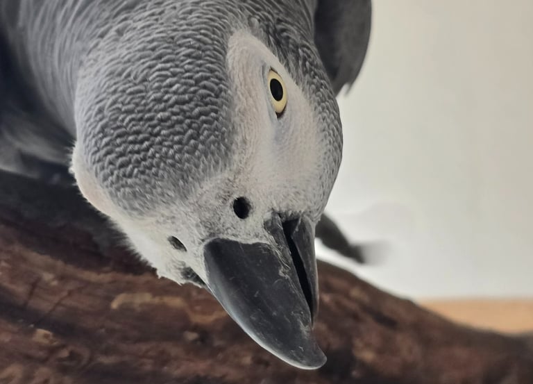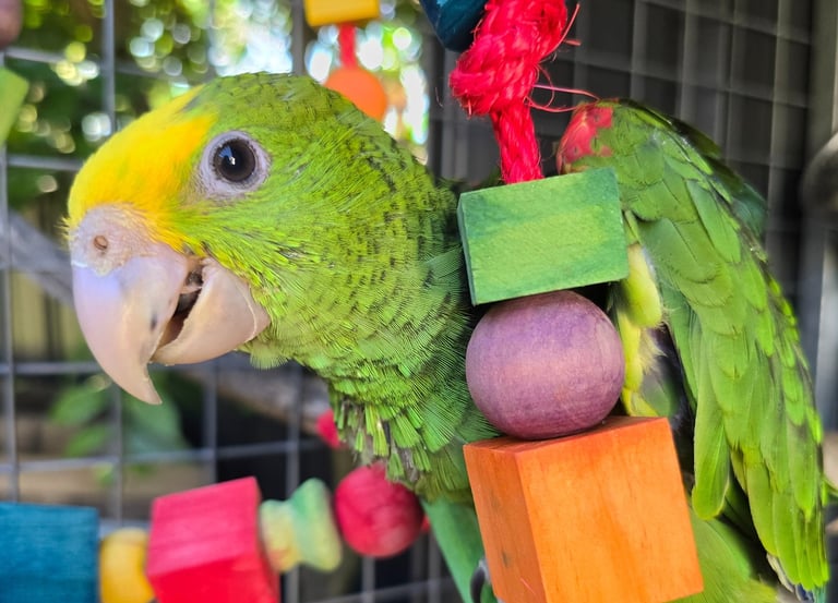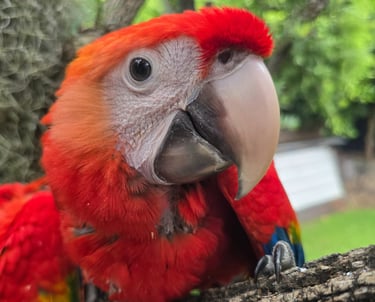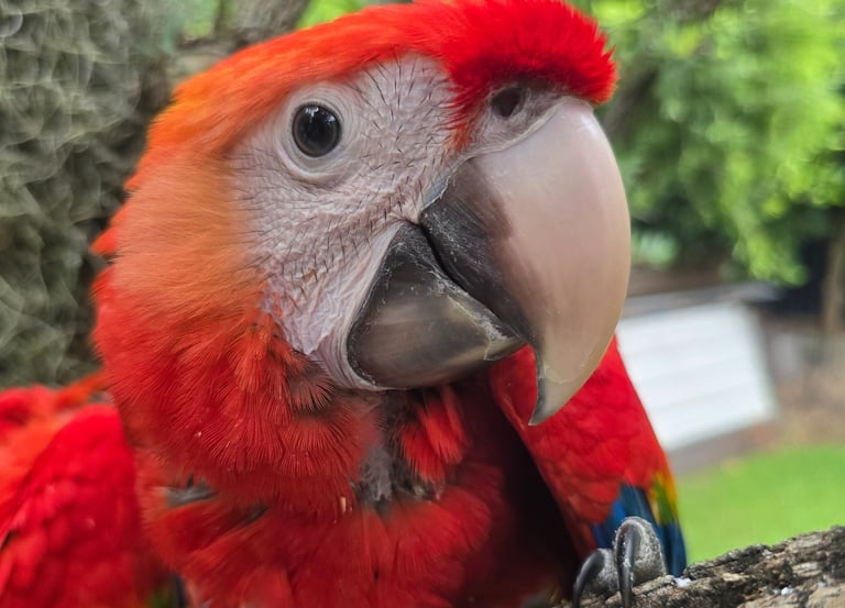Sierra is a stunning scarlet macaw with a big personality and an even bigger heart. Playful and curious, she loves to explore her surroundings, climb, and show off her brilliant feathers in the sunshine. Social by nature, Sierra thrives on interaction — whether it’s enjoying a gentle head scratch, or simply keeping you company.